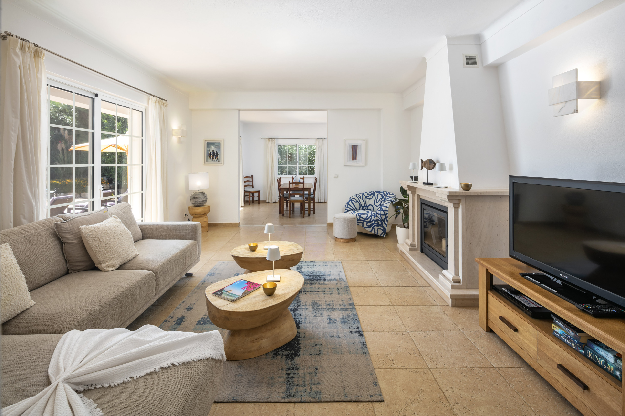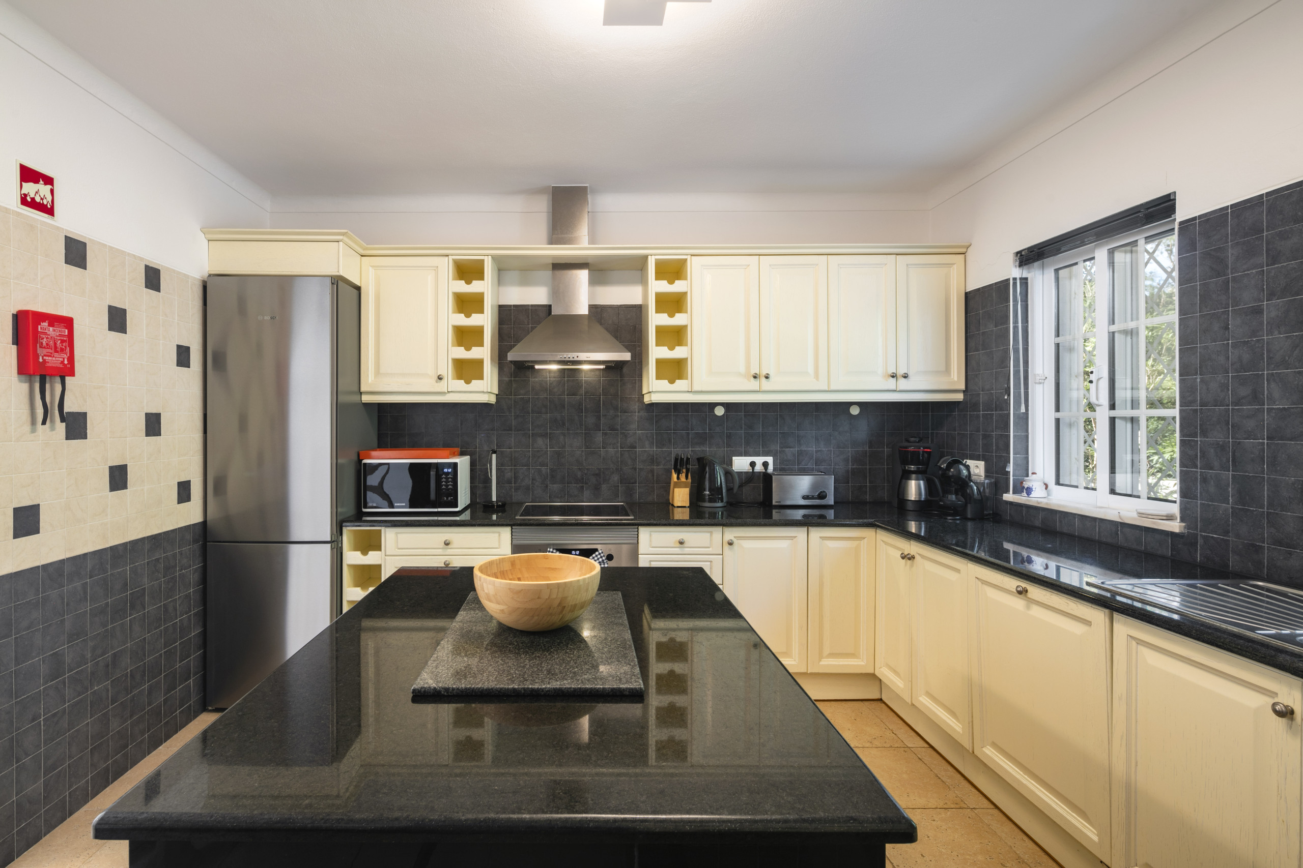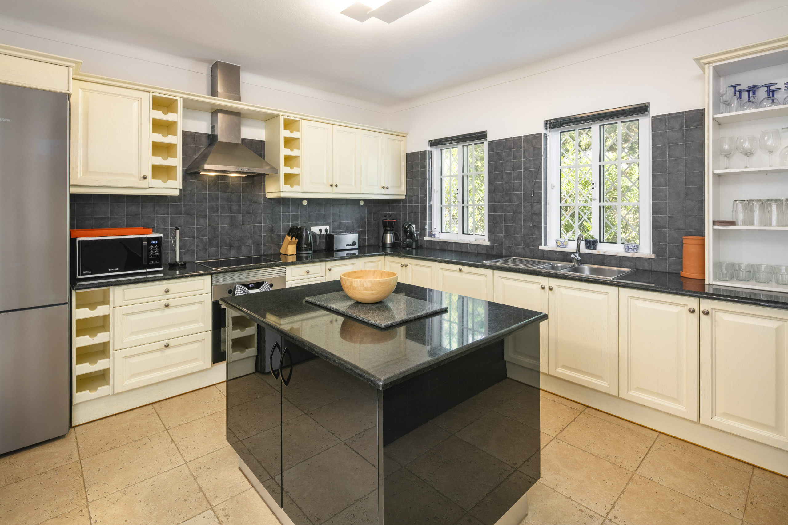 A sala de estar/jantar espaçosa e bem mobilada tem um bar embutido, lareira, TV via satélite (canais gratuitos) e leitores de DVD e CD. A cozinha grande e bem equipada com bancadas de mármore preto e armários de madeira clara inclui um combinado de frigorífico com congelador, máquina de lavar roupa, micro-ondas, máquina de lavar louça e placa vitrocerâmica com forno.