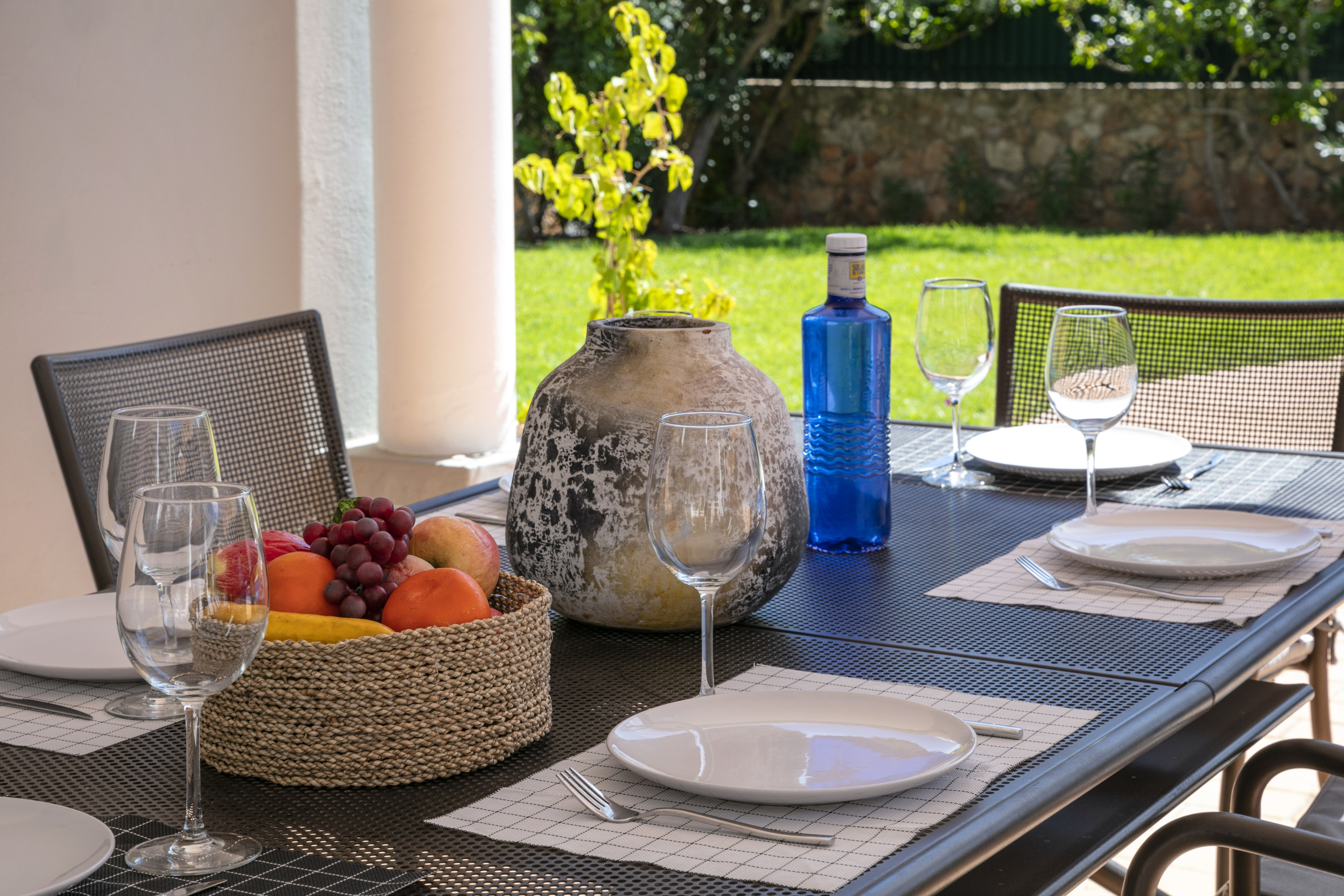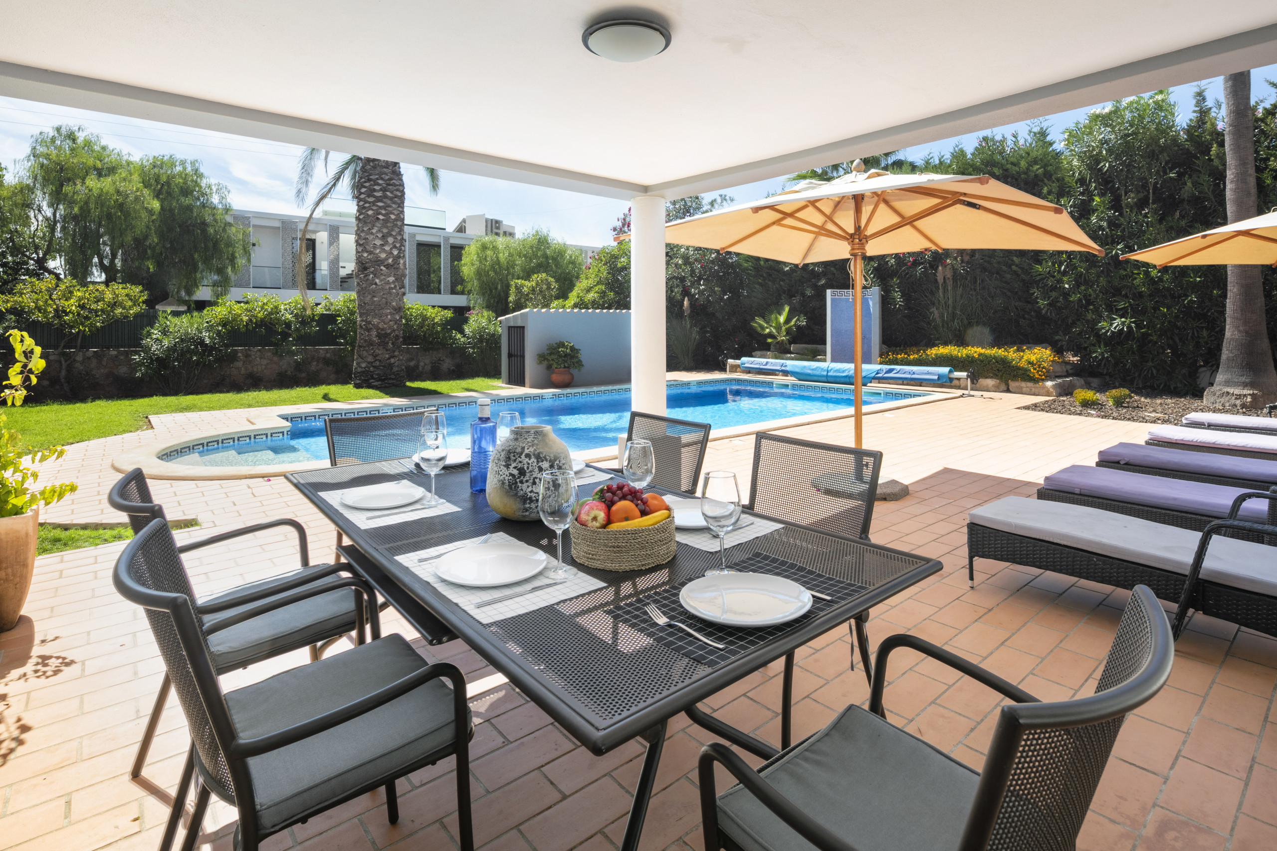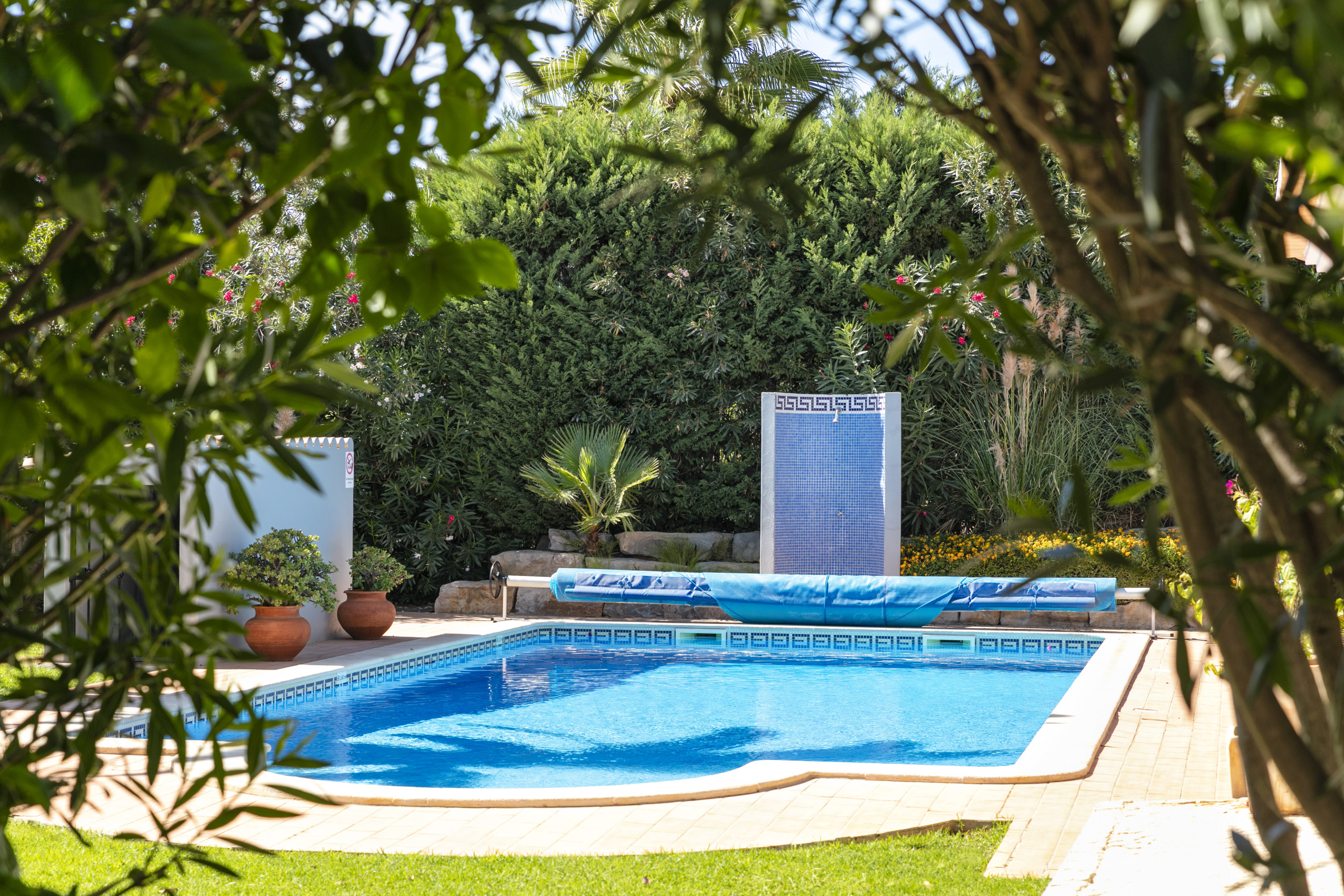 Envolvida por um belo jardim maduro, a moradia oferece amplos terraços parcialmente cobertos com mobiliário de exterior e uma piscina privada (aquecível a um custo adicional), com um chuveiro e espreguiçadeiras.